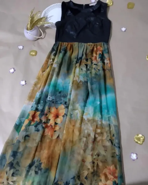Hermoso vestido largo, con diseño floral en toda la falda, la parte del pecho es polipiel con bonito corte. En perfecto estado