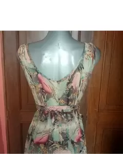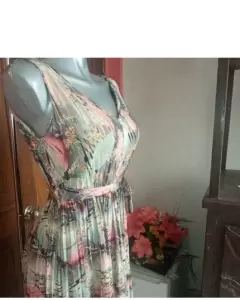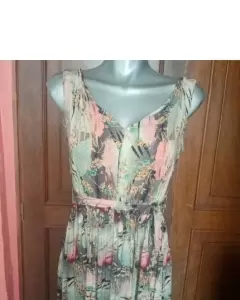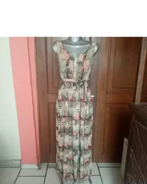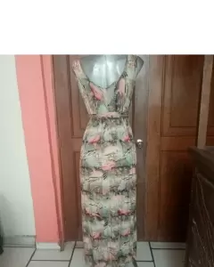 Hermoso vestido largo, multicolor, escote en V, resorte en cintura y cordón de amarre, talla grande, axila 48cm, cintura 28cm ( resorte estira hasta 46cm) 119cm.