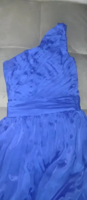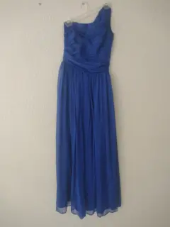 Vestido largo para fiesta. Talla extra chica. Vestido largo, un sólo hombro. Corte drapeado para dar volumen. Falda con caída. Tela con ligero brillo. Forro en la falda.