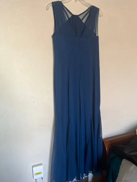 VESTIDO DE FIESTALARGOAZULTELA LIGERA LICRA CON TRANSPARENCIASCON VUELO EN LA PARTE INFERIORTALLA 10P, MARCA R&M RICHARDS