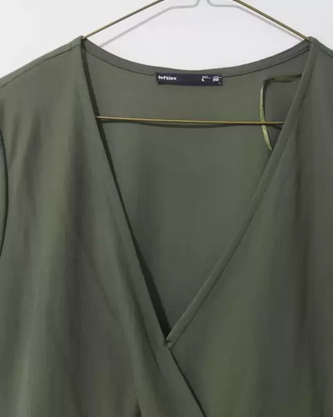 Vestido Lefties. Bonito vestido tono verde militar con coquetos listones a los lado de adorno, asi como doble plisado dando un toque coqueto y femenino