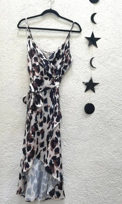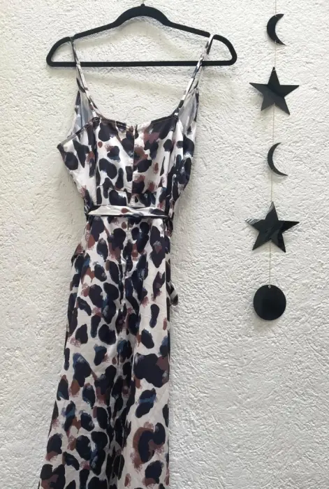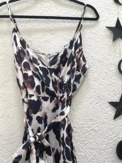 Hermoso vestido con estampado de leopardo, tela satin, con un lazo en la. Cintura para dar forma, escote en V, y cierre en la parte de atrás.