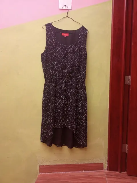Hermoso vestido sin detalles de uso, ligero marca vanity, talla 34, color negro con puntos blancos.