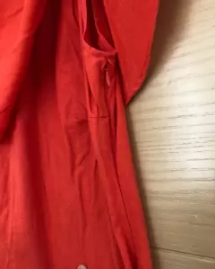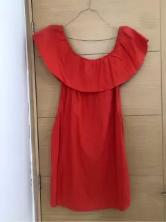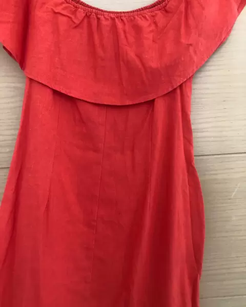 Vestido corto de Lino color Naranja, con Olán al frente, que puede bajarse a los hombros, marca life Style talla G