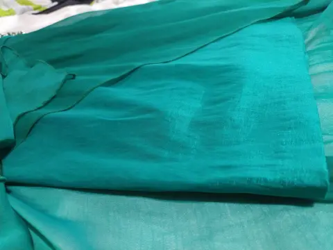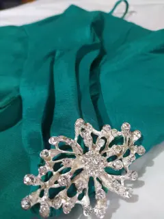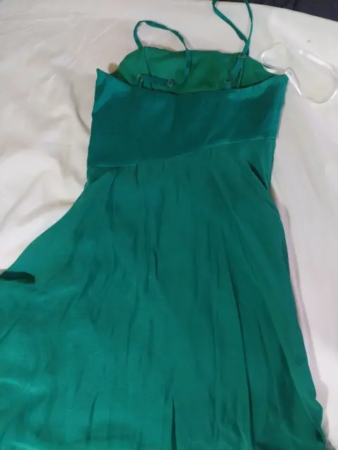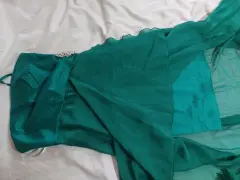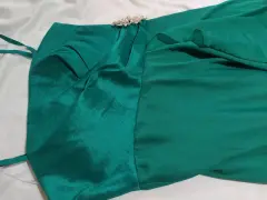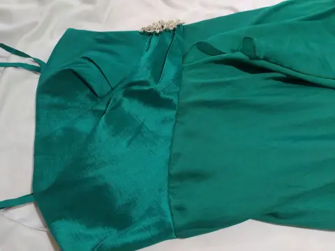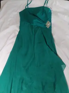 Hermoso, color verde botella. Con aplicación de broche en la cintura. Cierre de lado, con varilla para no deformarse, diseño de vestido corto con cola larga.