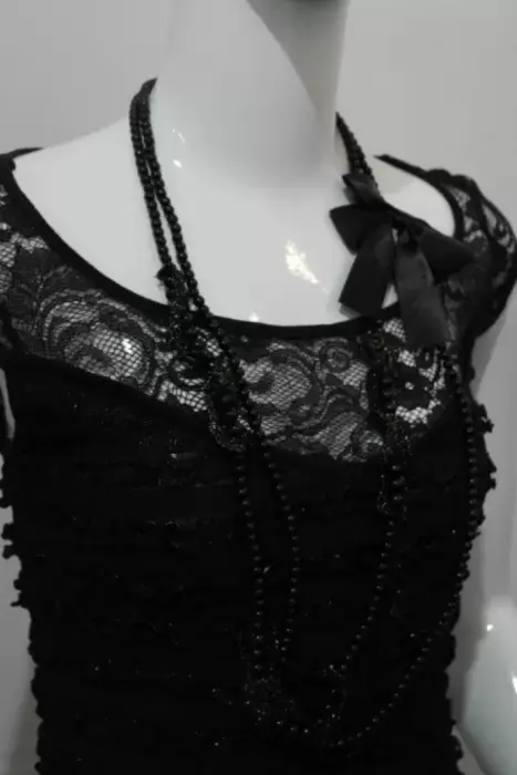 Vestido LOB encaje negro tipo cabaret. Me encanta este vestido, lo compré sin probármelo y no me quedo nunca. Viene con el collar y si ves bien la foto, tiene unos destellos dorados en los holanes del encaje.