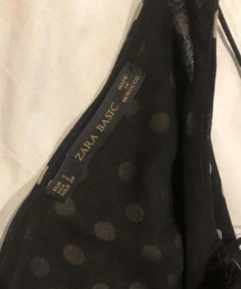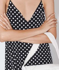 Vestido de lunares, corte recto con olan abajo, es corto (arriba de la rodilla) y con cierre lateral.