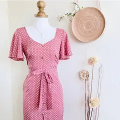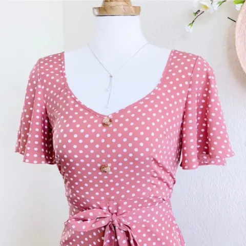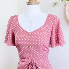 Vestido lunares rosa 0042023. Hermoso Vestido rosacierre espaldalunares blancos, tiene en manga mariposa cinturón de telaTalla MPecho 86-98 cmCintura 76-84cmLargo 103cm100 % poliéster
