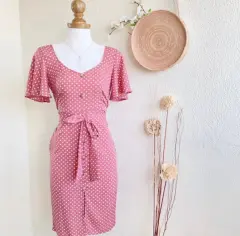 Hermoso Vestido rosacierre espaldalunares blancos, tiene en manga mariposa cinturón de telaTalla MPecho 86-98 cmCintura 76-84cmLargo 103cm100 % poliéster