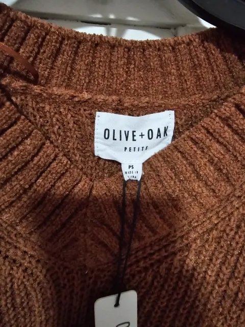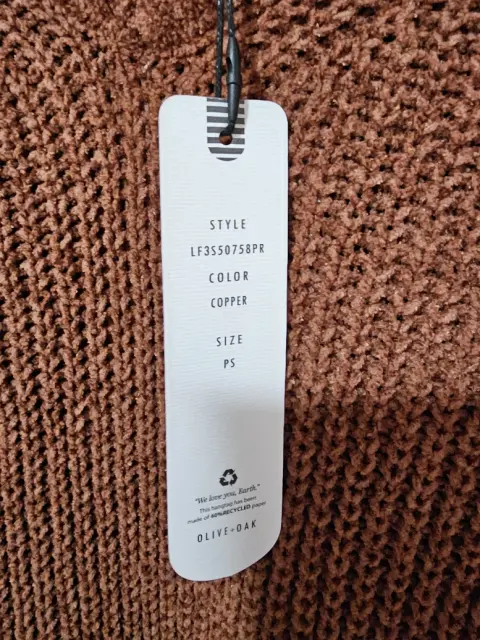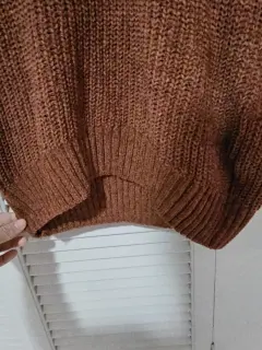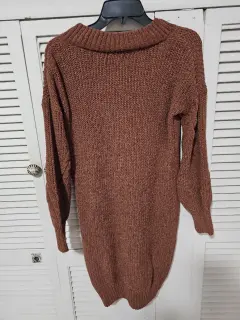 Vestido manga larga tejido, a la rodilla color marrón, cuello en v, queda suelto, la parte de abajo es ligeramente más corto enfrente
