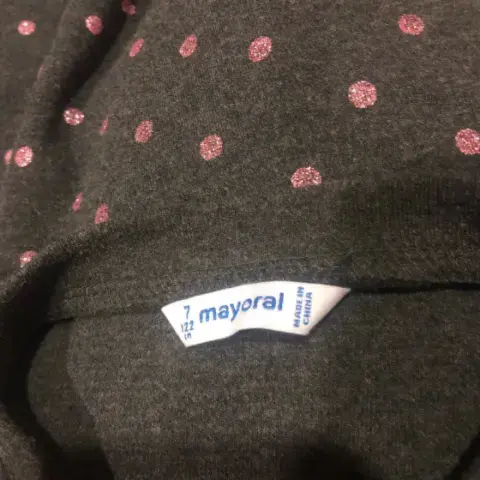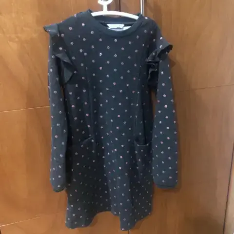 Vestido manga larga de niña talla 7 marca mayoralEs gris con bolitas rosas con brillos y tiene olanes en las sisasDivino y en perfecto estado
