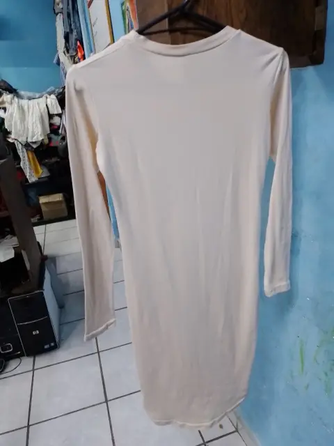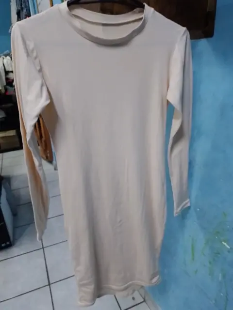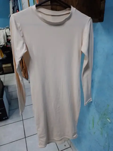 Vestido manga larga talla chica estira. Vestido de manga larga color beige estira poco