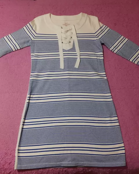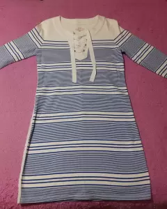 Vestido manga tres cuartos, color blanco con rayas horizontales azules y tejido de agujeta y la parte del pecho.