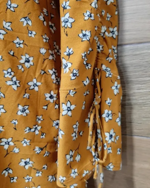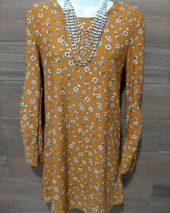 Vestido corte A, color amarillo con print de flores blancas. Manga larga, cuello redondo, tela strech y súper fresca. Queda hasta a una talla G.*incluye el collar(usado)