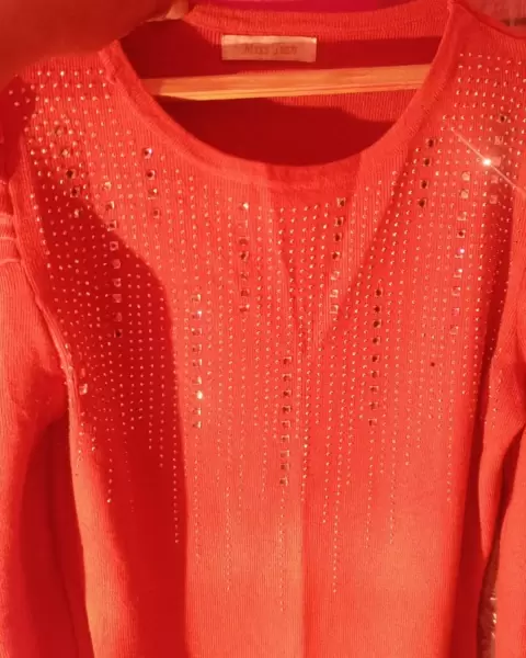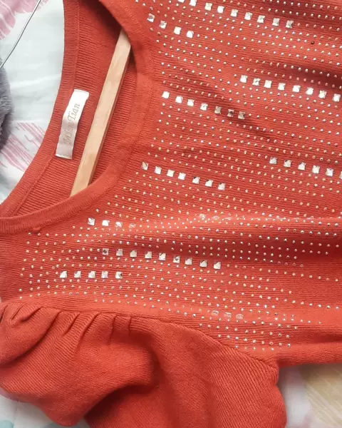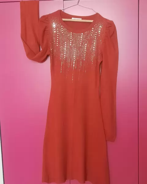 Vestido material tipo sueter. Hermoso Vestido manga larga estilo tipo princesa manga tipo presunto Unitalla queda entre S y LColor anaranjado con brillos/ piedras de fantasia