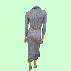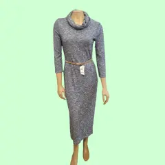 Vestido Maxy Forever 21, talla grande, color gris claro, cuello de tortuga, manga 3/4, habierta mediana a un lado bajo, hecho de poliéster, rayón y elastano, estilo slip-on, mide 38cm de hombro a hombro, 19cm de largo en cuello, 39cm de axila a axila, 38cm de cintura con pretinas para cinturon (no lo incluye la venta), 118cm de largo del hombro hacia abajo con abertura de 32cm en parte baja, usado