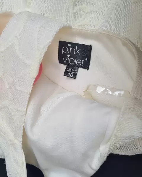VESTIDO MESH TALLA 10. VESTIDO MESH COLOR CREMA,GRABADO DE FLORES,MARCA PINK VIOLET,DETALLE 2 CUBOS NO VIENEN,TALLA 10 AÑOS (REDUCIDO COMO A 8)MIDE 34 CM DE AXILA A AXILA,63 CM DE CINTURA, 72.5 CM DE LARGO,COLOR CREMA