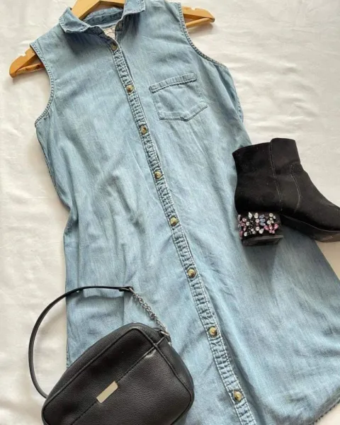 Vestido mezclilla ligera. Hermoso vestido de mezclilla con cuello y sin manga super fresco y cómodo ligero queda por arriba de la rodilla