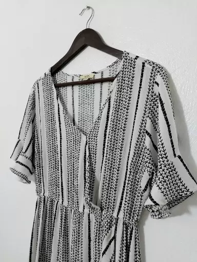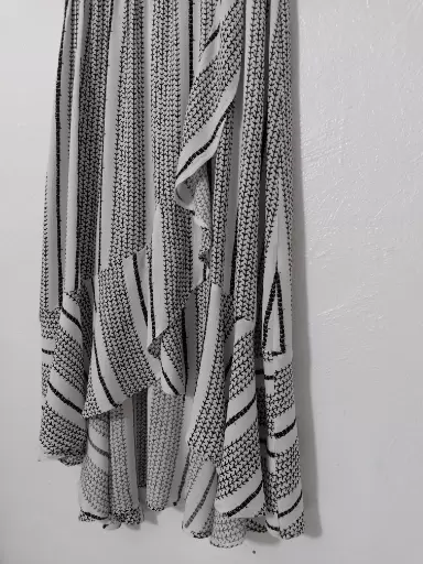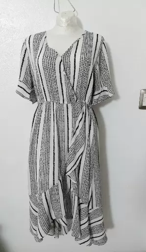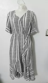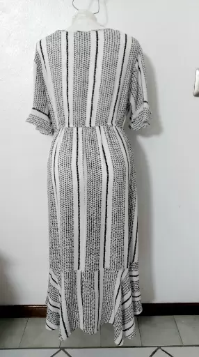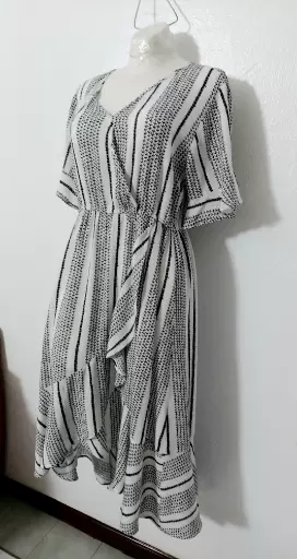 Vestido Midi B/N con olanes. Hermoso!Talla LCon resorte bajo el busto pero no en cintura.Amolda súper lindo.Tela tipo corrugada y es 100% rayón
