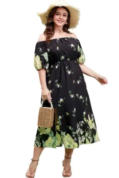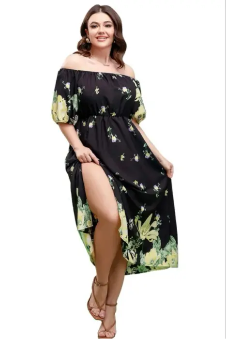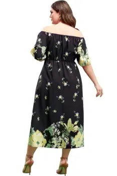 Vestido midi abertura piernaManga cortaHombros descubiertosTela ligeraEstampado flores