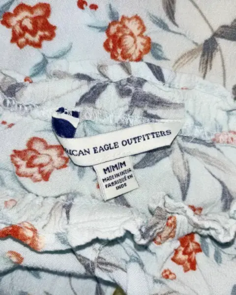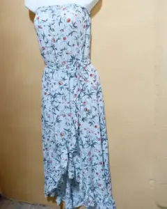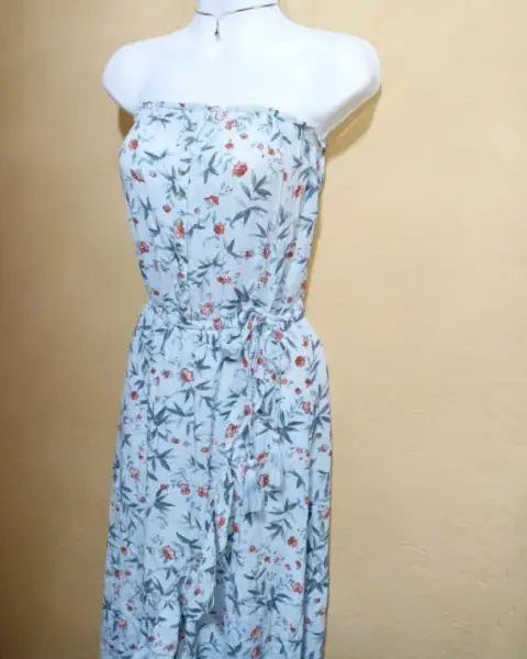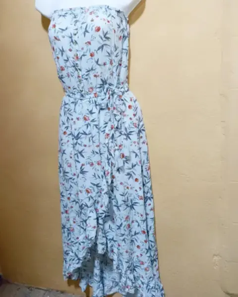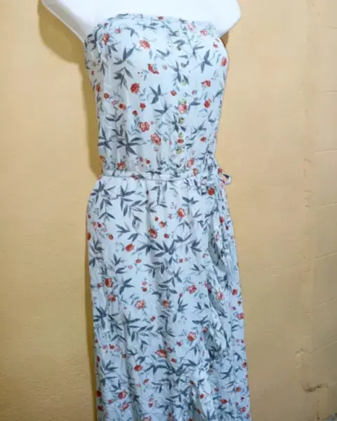 Vestido midi straple AE. Hermoso vestido azul cielo con flores, muy fresco , con abertura en pierna Es talla M y también queda a L ya que estiraTela : 100% viscosa Prácticamente está nuevo, nunca se usó