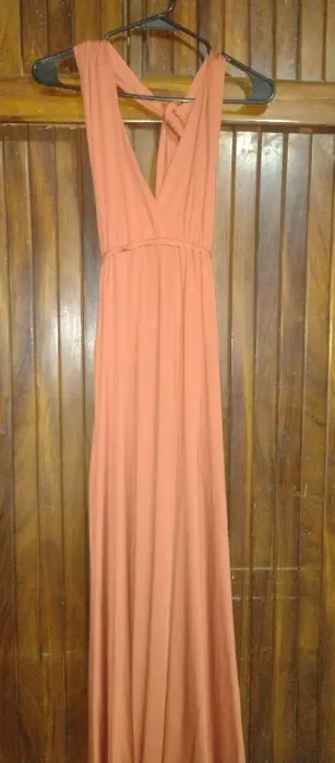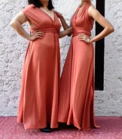 Vestido "mil formas" talla chica. Vestido largo, tela stretch, se amolda al cuerpo. La parte de atrás es ligeramente más larga que el frente, con forma circular. Los tirantes largos y anchos permiten acomodar el vestido de diferentes maneras.