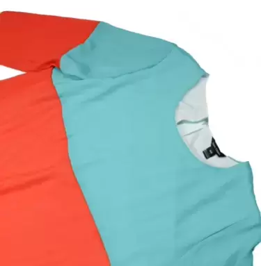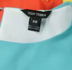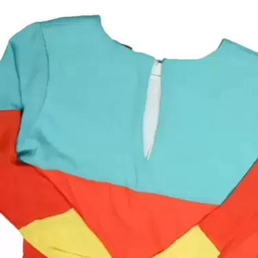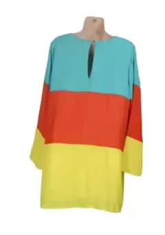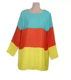 Vestido mini colores talla XL fresco. Vestido mini de franjas de colores amarillo, naranja y azul, cuello redondo con mangas largas. Tiene botón en la parte trasera del cuello para abrocharse.