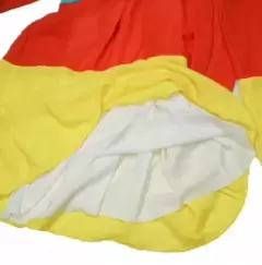 Vestido mini de franjas de colores amarillo, naranja y azul, cuello redondo con mangas largas. Tiene botón en la parte trasera del cuello para abrocharse.