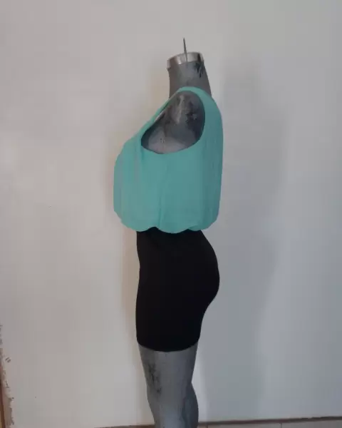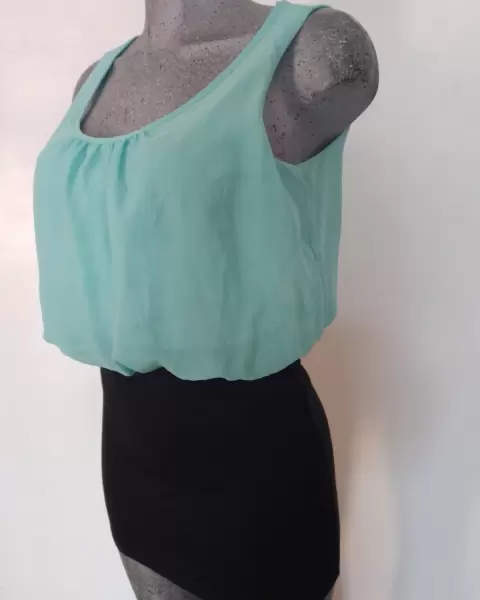 Bonito vestido corto, se ajusta bien en la cadera, la tela estira y de la blusa es suelto, dice talla M pero queda a talla S, se usó una sola vez