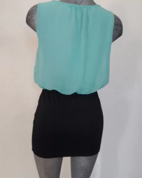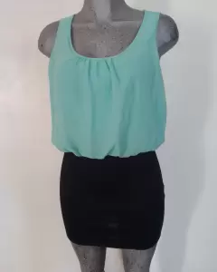 Vestido moderno. Bonito vestido corto, se ajusta bien en la cadera, la tela estira y de la blusa es suelto, dice talla M pero queda a talla S, se usó una sola vez