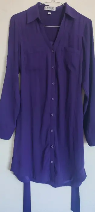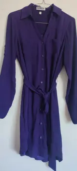 Vestido color morado con manga que se puede recoger a tres cuartos, con forro para no transparentar. Para usar sin mallas o con mallas o leggins
