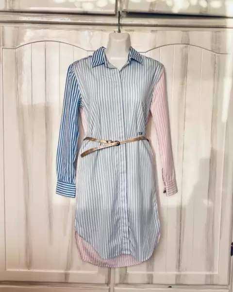 Vestido multicolor original, la marca grabada en botones y bordado en la manga y la parte frontal. El listón característico de la marca en las orillas de las mangas. Incluye el cinturón