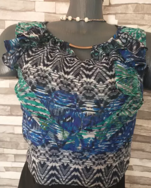 Vestido multicolor. Hermoso vestido talla 18 falda negra y lo de arriba es tela de gasa delgada con forro trae un adorno dorado en el frenteLas medidas sonAxila a axila 59 cmCintura 50 cmCadera 60 cmLargo total 96 cm