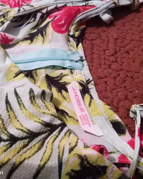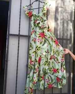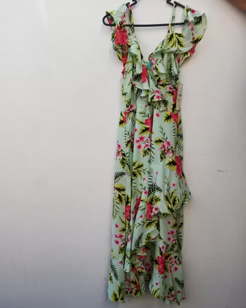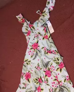 Vestido de tirantes con simulación de manga campesina, escote en V cruzado.Elástico en cintura que favorece tu silueta, elaborado en tejido de mano. Cero detalles.100% nueva.En excelentes condiciones.