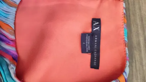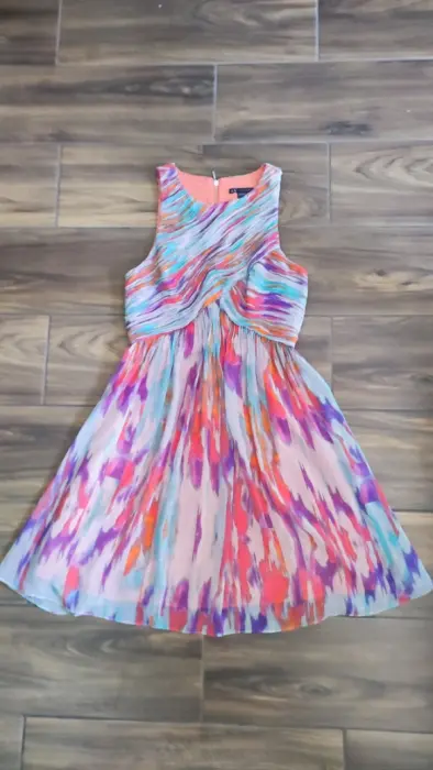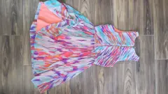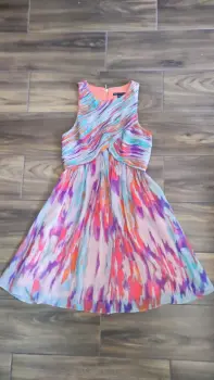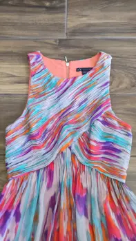 Vestido multicolor talla 2. Vestido sin mangas, a la altura de la rodilla, frente drapeado, amplio de la falda