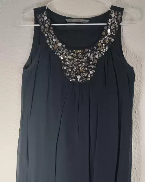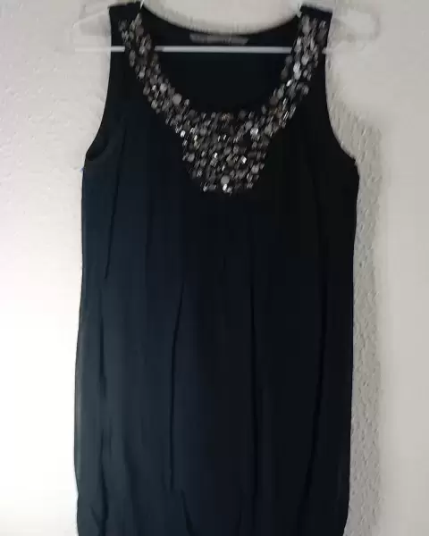 Vestido muy elegante color negro. Vestido elegante de fiesta o evento especialConchaquira en el cuelloSin mangas y bombachoMuy cómodo y elegante