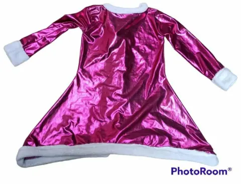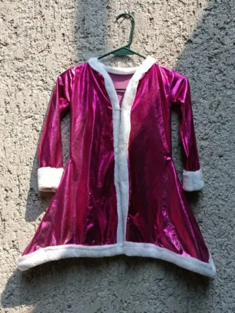 VESTIDO ROSA METÁLICO NAVIDEÑO, TUPO SANTA CLAUS, CON BOTONES AL FRENTE, TALLA 7/8 APROXIMADAMENTE,MIDE DE HOMBRO A HOMBRO 35 CM, DE AXILA A AXILA 36 CM, DE LARGO 62 CM, CINTURA 68 CM