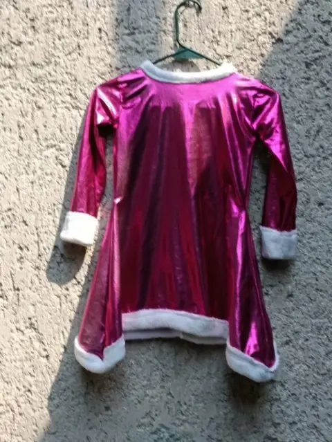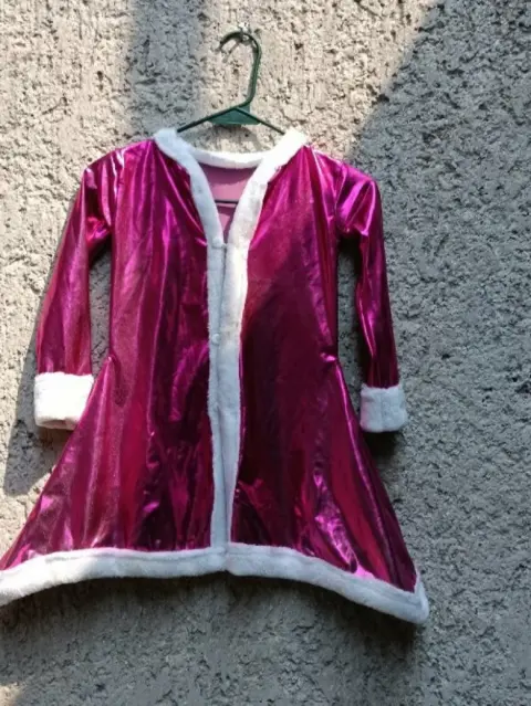 VESTIDO NAVIDEÑO FIUSHA METALICO. VESTIDO ROSA METÁLICO NAVIDEÑO, TUPO SANTA CLAUS, CON BOTONES AL FRENTE, TALLA 7/8 APROXIMADAMENTE,MIDE DE HOMBRO A HOMBRO 35 CM, DE AXILA A AXILA 36 CM, DE LARGO 62 CM, CINTURA 68 CM