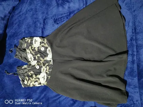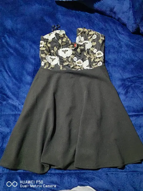 Vestido negro. Talla medianaSi largó es arriba de la rodilla.Escote de tirantes.Apertura en v.Acabados en color dorado.