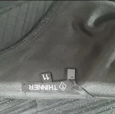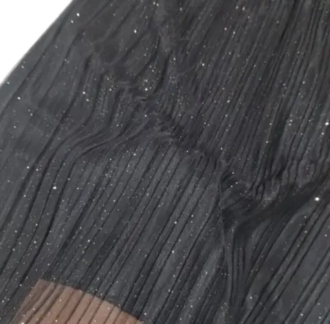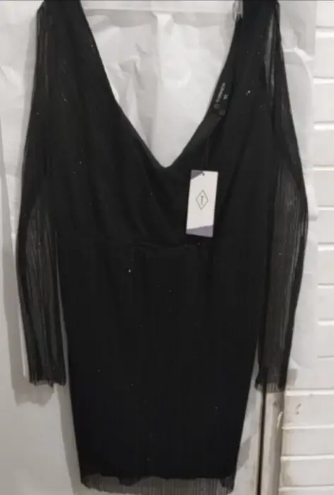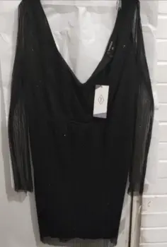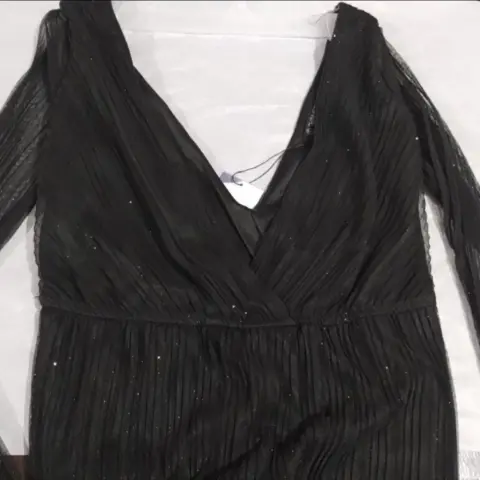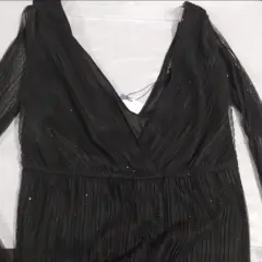 Vestido de fiesta en color negro con escote en "v", la tela es negra con brillitos dorados, trae un bonito efecto en las mangas.