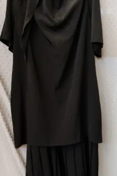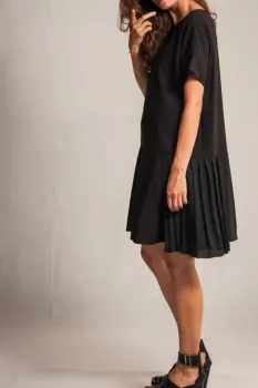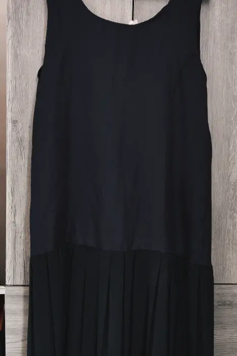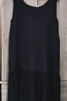 Vestido negro 2 piezas. Vestido retro compuestoTalla 38 (Queda a talla L)La pieza del fondo es como un vestido de tirantes que lleva tablones y encima va el blusón.(Nota: las primeras imagenes solo son referencia de cómo se vería puesto ya que el diseño es similar)No presenta ningún detalle.