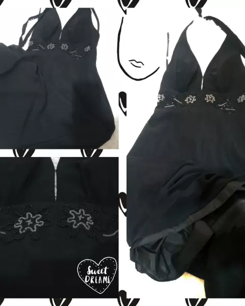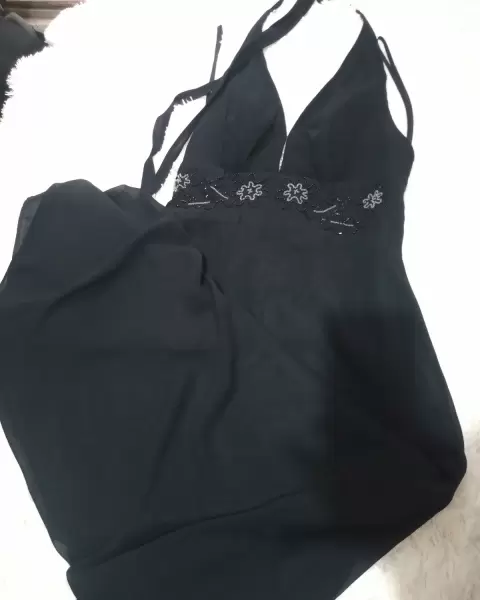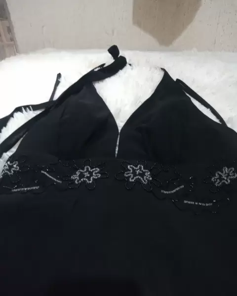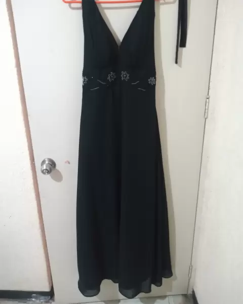 Vestido negro tipo halter, de gasa detalle abajo del busto negro y plata resucite escote pronunciado enfrente y espalda