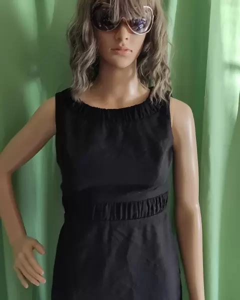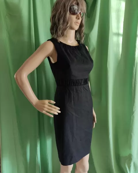 Hermoso vestido negro acinturado, talla extra chica, con forro, 99 porciento lana. 1 spandex. Medidas, axila-axila 42, cintura 35, largo 86.Envío todos los días de lunes a sábado