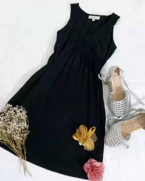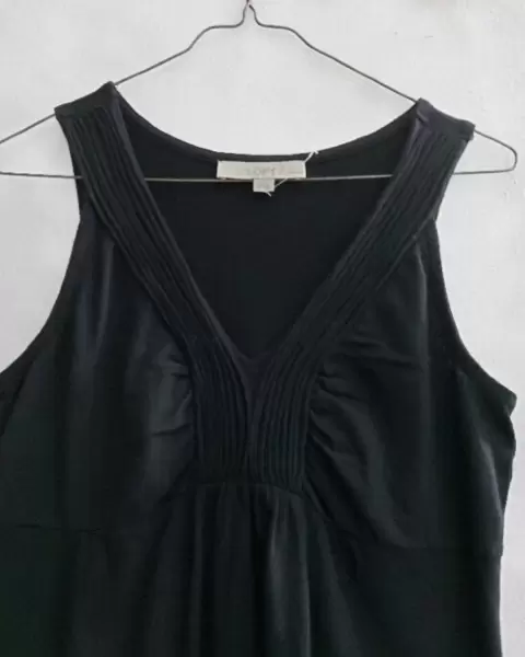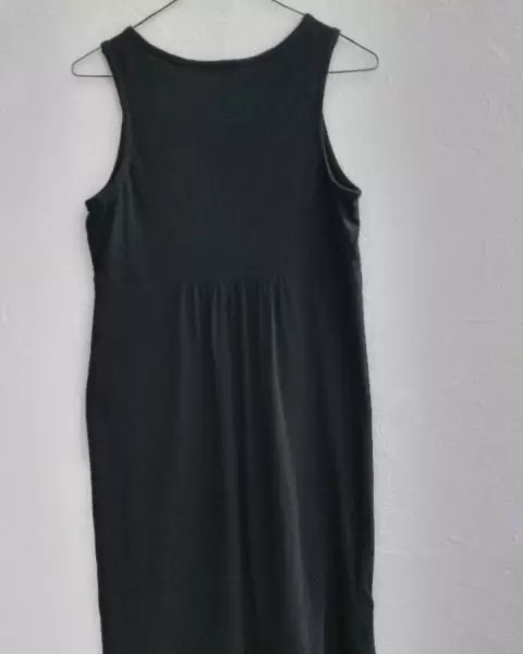 Es un vestido lindo, cómodo, fresco, tela 100% algodón, en tono negro con mucho strech. Mide de axila a axila: 42 cm, hombros: 31 cm, largo: 82 cm.