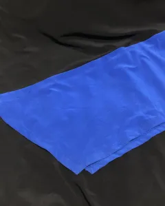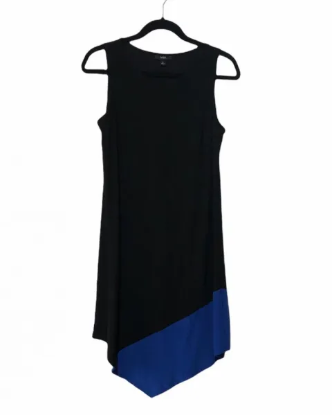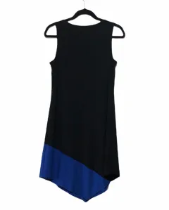 Vestido negro con azul rey. Diseño que termina en triángulo. Medidas: axila a axila 44.5 cm (89 cm circunferencia total) largo 101 cm