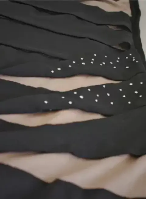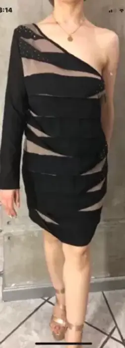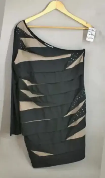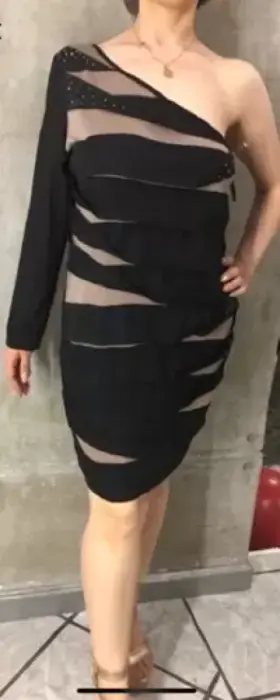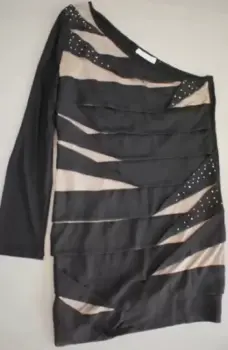Vestido negro con beige y piedritas solo tiene una manga es muy moderno y muy lindo es corto. Talla M, también lo tengo en otra publicación en L.