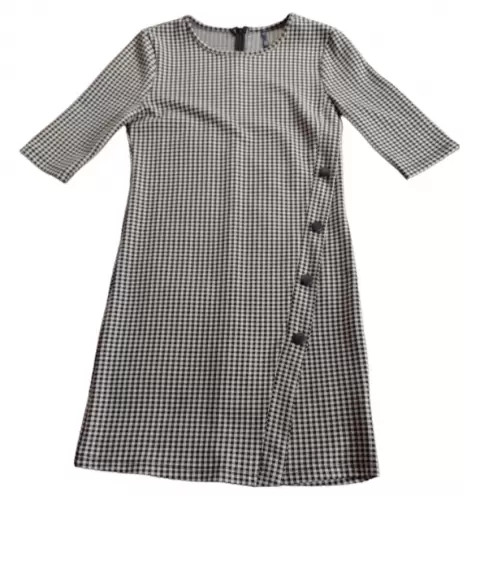 Vestido negro con blanco, detalle de botones, cierre en la parte de atrás, mangas 3/4, talla S, marca C&A.