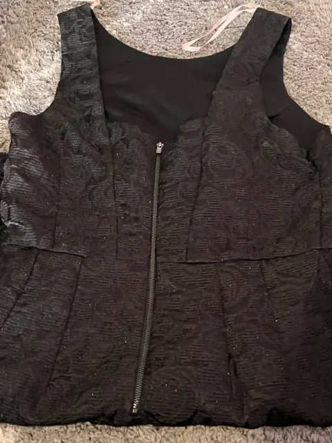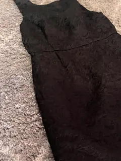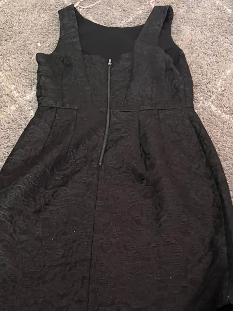 Hermoso vestido negro con brillitos y estampado de relieve de flores. Súper lindo. La tela no estira. Escote cuadrado en espalda. Cierre en espalda. Medidas ax a ax 42 cm, cintura 33 cm, largo 86 cm.