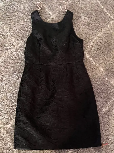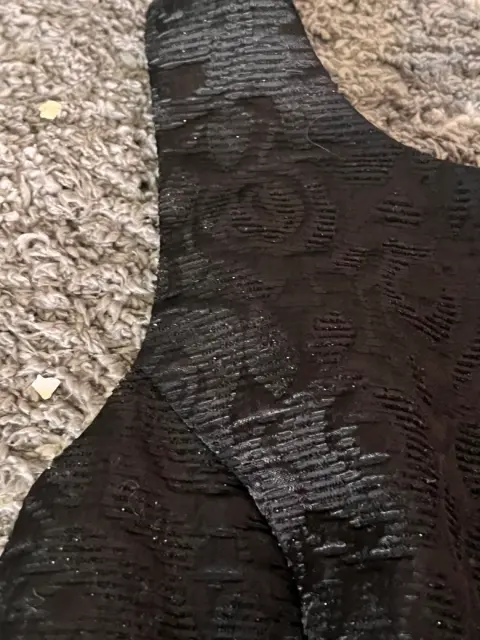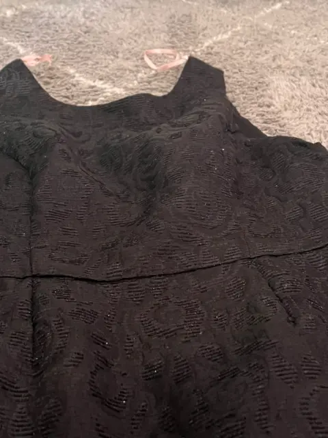 Vestido negro con brillitos. Hermoso vestido negro con brillitos y estampado de relieve de flores. Súper lindo. La tela no estira. Escote cuadrado en espalda. Cierre en espalda. Medidas ax a ax 42 cm, cintura 33 cm, largo 86 cm.