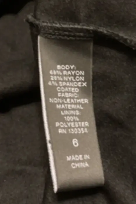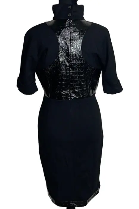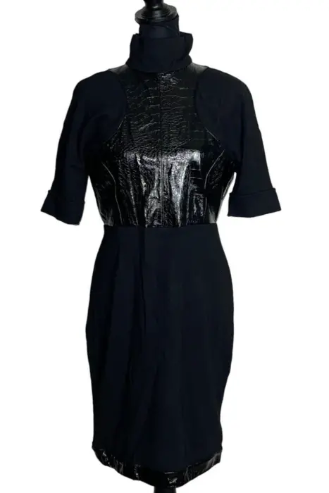 Vestido negro con detalles de vinil. Talla 6= SBusto: 91.44 cmCintura: 72.39 cmCadera: 97.79 cmMangas: 22.86 cmLargo: 96.52 cmMateriales: 68% rayón, 28% nylon y 4% spandex- forro: 100% poliéster